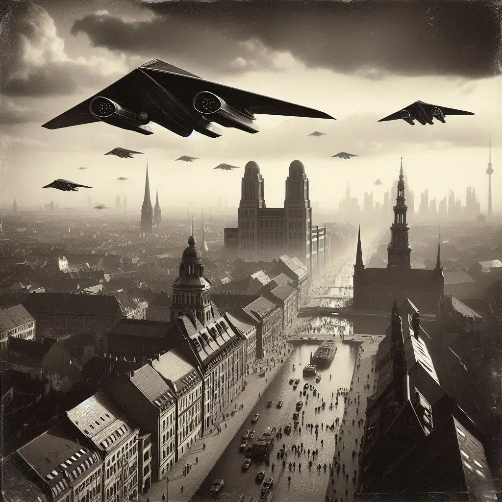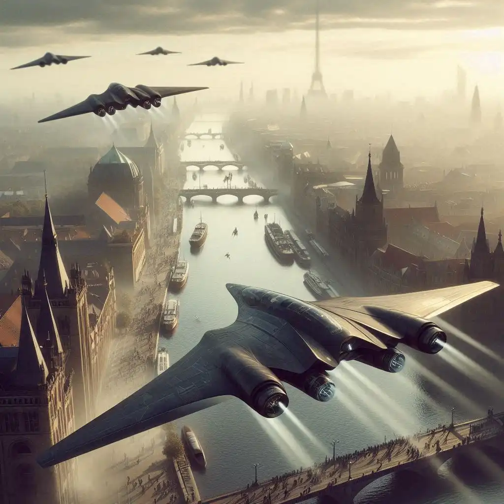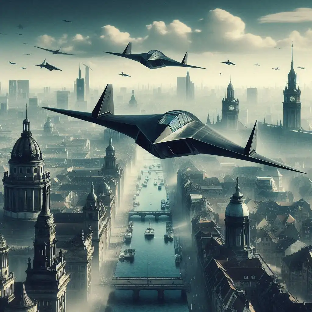 - Prototipos de cazas invisibles a radar, inspirados en los futuros F-117, fabricados con polímeros absorbentes de señales diseñados con fórmulas aún desconocidas por la ciencia de la época.