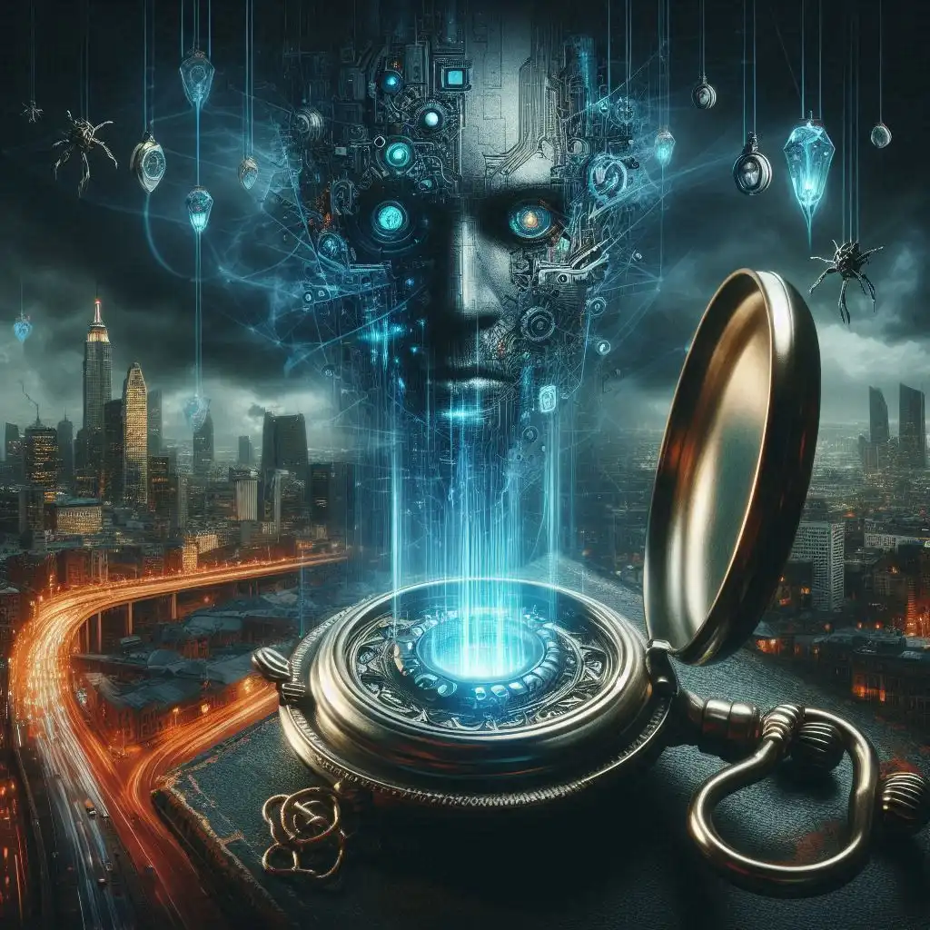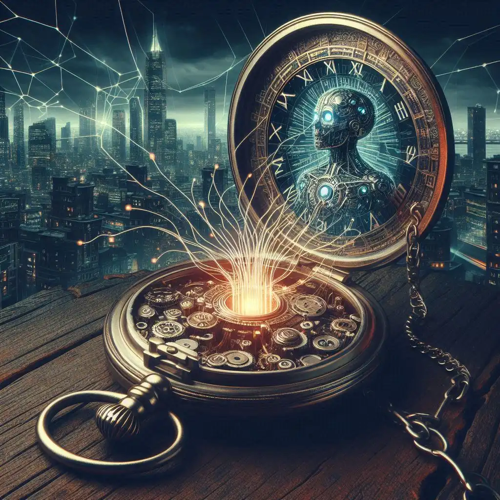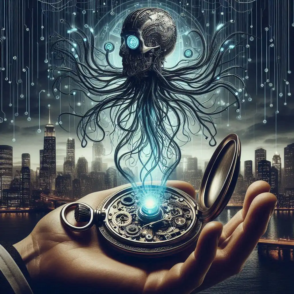 Dentro, la parte electrónica que faltaba para completar el reloj de bolsillo de Dumont. De engranaje mecánico, diseño victoriano y un brillo cálido que contrastaba con el mundo frío que lo rodeaba. Pero no era un reloj cualquiera. Al desmontarlo, Claire descubrió un diminuto conector y un código grabado en su interior, una especie de llave de acceso analógica que resonaba con la red del Oráculo Electrónico.