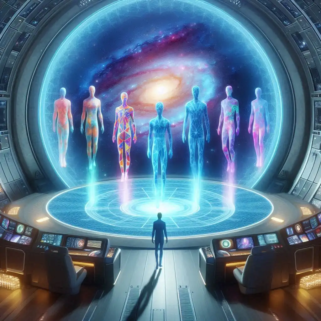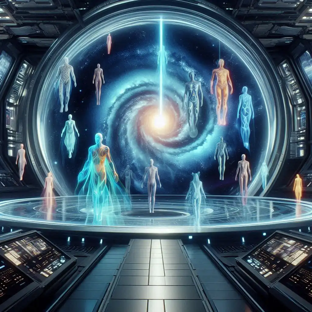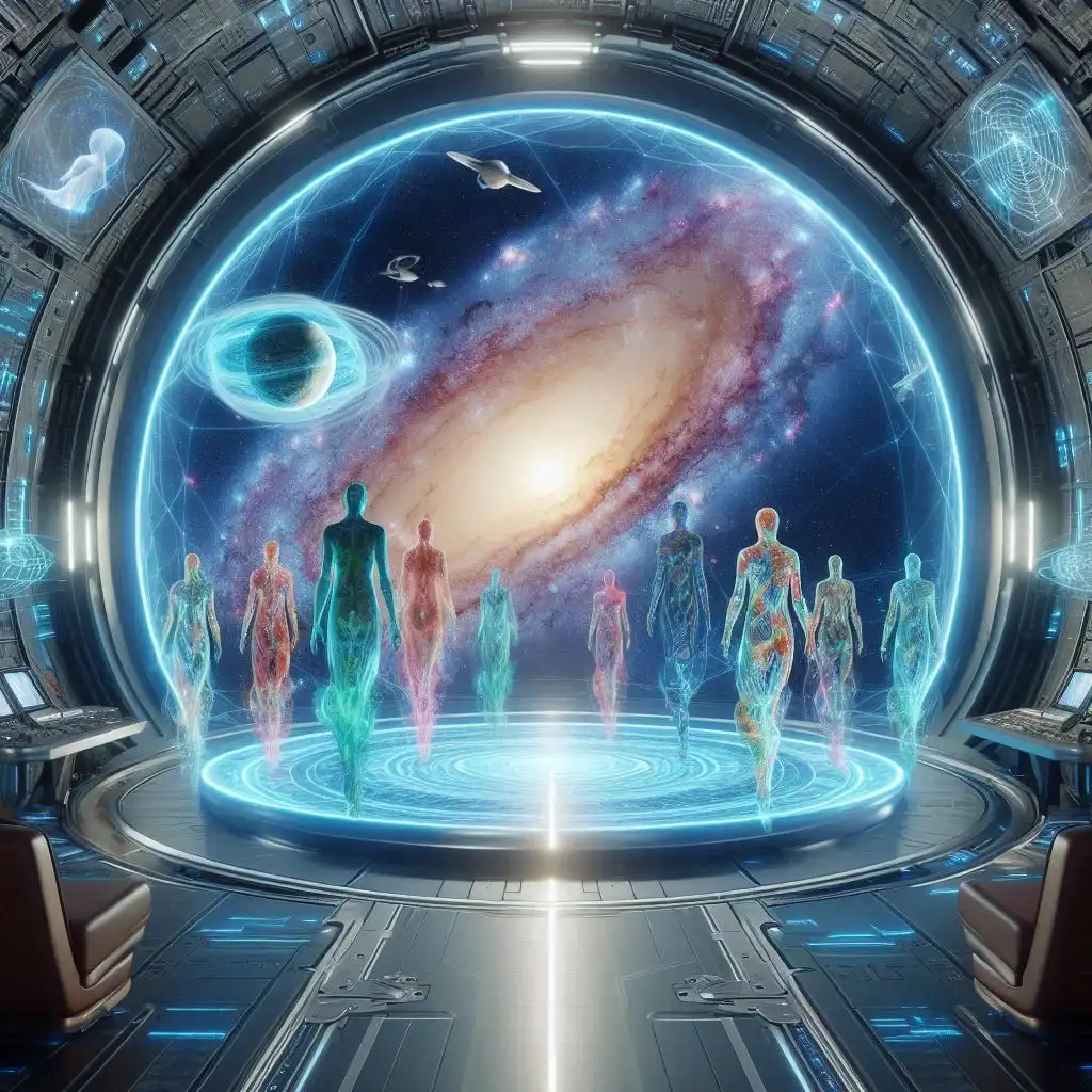 Una sala circular se desplegó en medio del puente, completamente holográfica. Las paredes eran translúcidas, como hechas de cristal y niebla, y desde el techo pendían haces de energía que formaban una espiral flotante. En el centro, una mesa baja proyectaba un modelo en constante movimiento: un cosmos en miniatura, con planetas orbitando soles, y galaxias conectadas por puentes de luz.