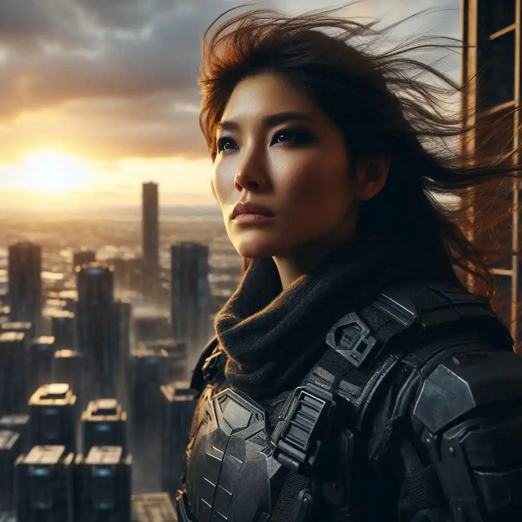 Imagen de Kora Shen mirando desde lo alto de una torre en Ciudad Escudo.